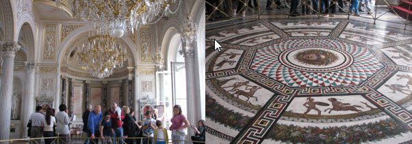 Lâu đài Catherine, hay còn gọi làng của Hoàng Đế Nga (Tsarskoye Village) có 30 đại sảnh lớn nhỏ, được xây cất qua nhiều thời kỳ, các đại sảnh đều được trang trí xa hoa lộng lẩy với bao nhiêu nhân lực và tài lực (sự giàu sang tột đỉnh với nếp sống xa hoa, phong kiến, xa rời đại đa số dân chúng đả phải là môi trường xúc tác và cội nguốn cho cuộc cách mạng vô sản tháng 10 năm 1917 của Bolsheviks với tiếng súng thần công nố từ tàu Aurora, phát súng tín hiệu cho sự nổi dậy và báo chung cho triều đại phong kiến Romanov.
