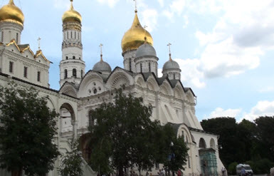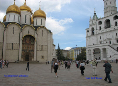 2-Giáo đường Dormiton (Assumption) trước đây là giáo đường chính của Nga , xây năm 1475-79 Phía trong giáo đường được trang trí bằng hình vẻ cổ xưa đạo giáo, cũng là nơi an nghỉ của những vị lảnh đạo đạo Chính Thống Nga (Russian Orthodox Church).Một trong những trưng bày được nhiều người chú trọng là chiếc ghế ngồi của Nga Hoàng Ivan the Terrible.
