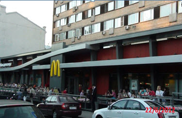 Rời khách sạn khoảng 100 m đã có hàng cà phê Starbucks, rồi gà chiên KFC, bên kia đối diện với công viên Pushkin có bồn phun nước là Mc Donalds. Đặc biệt phải nói đến đây là cửa hàng Mc Donalds đầu tiên ở Moscow và cả nước Nga mở ngày 30 Giêng (January) 1990. Thời ấy là một sự kiện quan trọng, trong những ngày đầu, khách phải sắp hàng 1-2 km dưới trời Đông. Chỉ hai năm sau thì chủ nghĩa Công Sản -Soviet Union sụp đổ 25/12/1991.