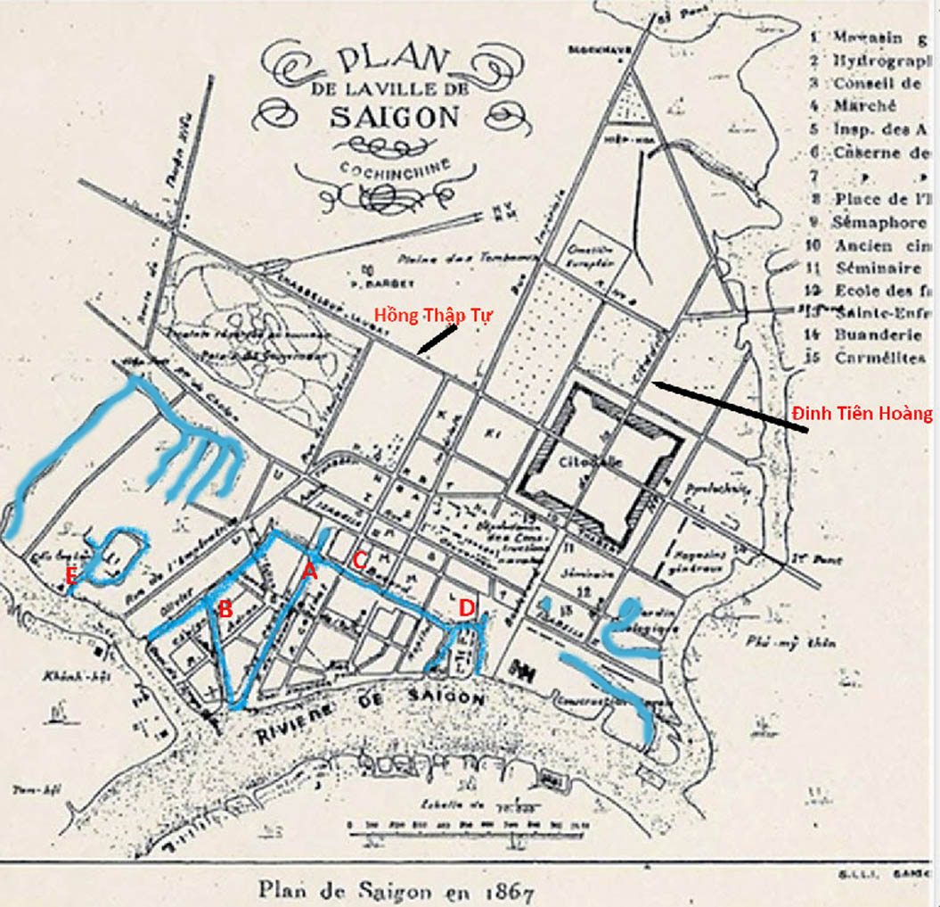Hình 17: Bản đồ 1867 với chú thích về kinh rạch khu này sau bị lấp đi biến thành đường xá.