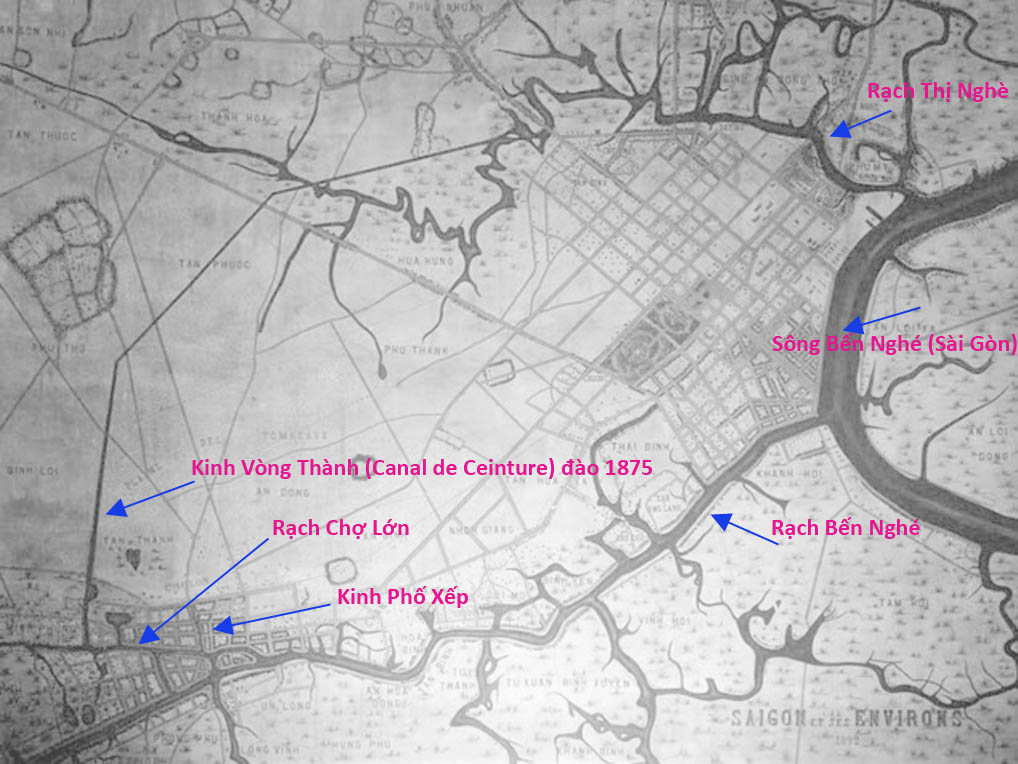 Người Pháp đến 1859, tiếp đó cho xây dựng thành phố Sàigòn chung quanh vùng Thành Quy (thời Gia Long xây 1790, phá 1835) khai thác hệ thống sông rạch thiên nhiên chằng chịt phát triển một thành phố thương mại dọc theo Arroyo Chinois (kinh Bến Nghé) nhằm đáp ứng công cuộc khai triển kinh tế và tăng cường khả năng lưu thông và vận chuyển thương thuyền, hàng hóa với miền Tây và Trung.