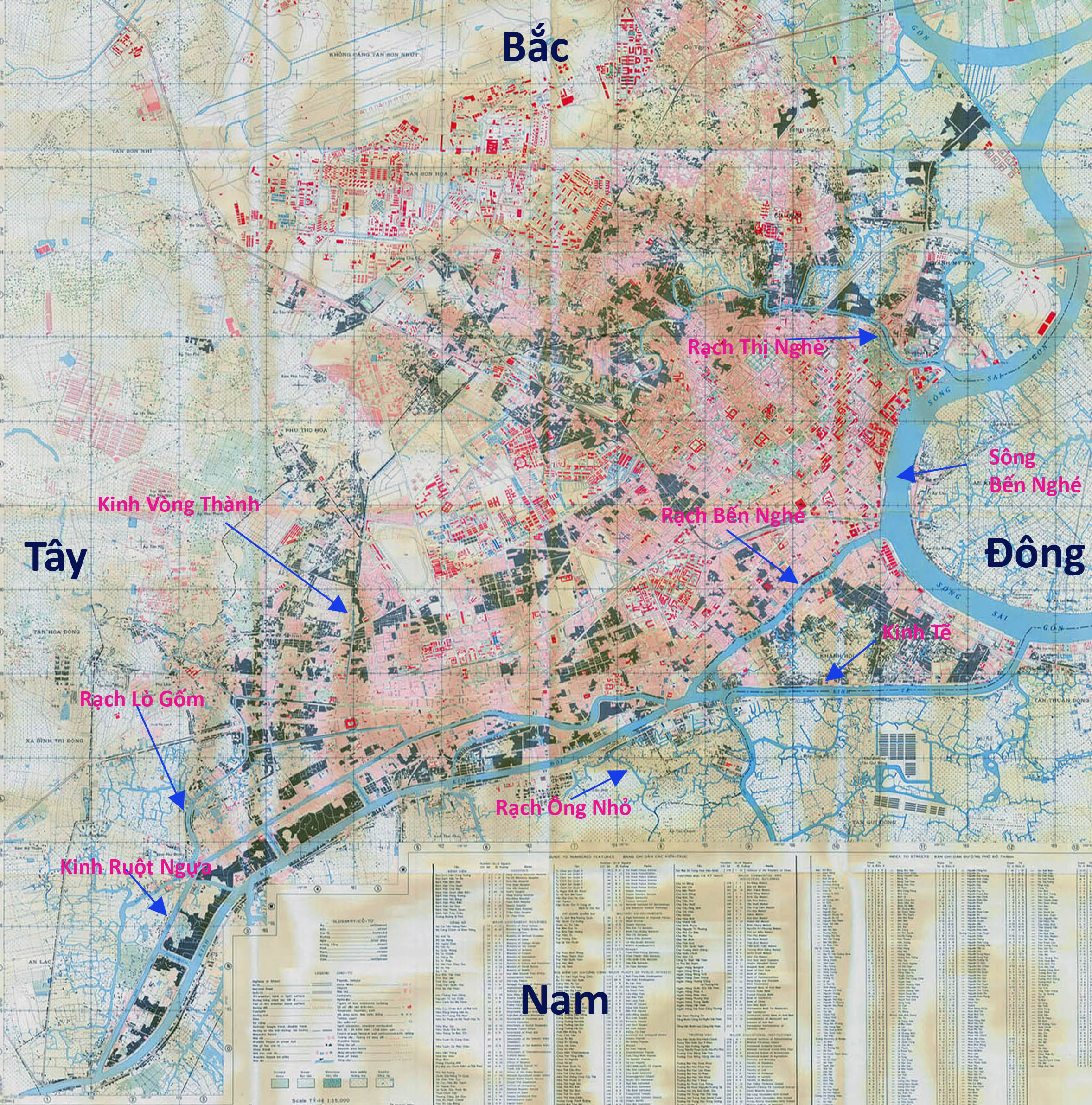 Hình 3: Bản đồ 3 thời VNCH năm 1962 cho thấy sông rạch bao quanh thành phố Saigon-Chơ Lớn sau khi kinh Tẽ (nhánh của rạch Bến Nghé) được đào năm 1905